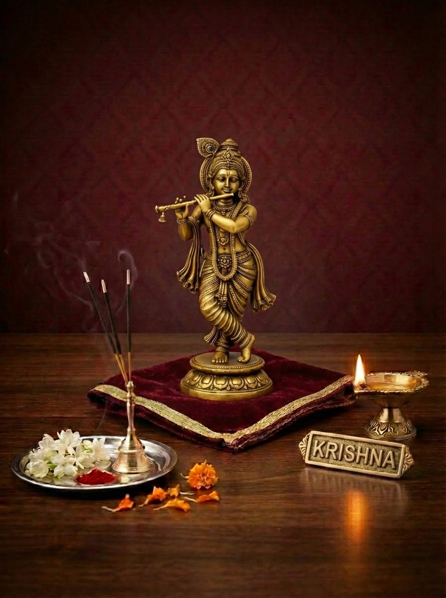Krishna murtis in warm antique gold — for mandir, home altar, and heirloom gifting.